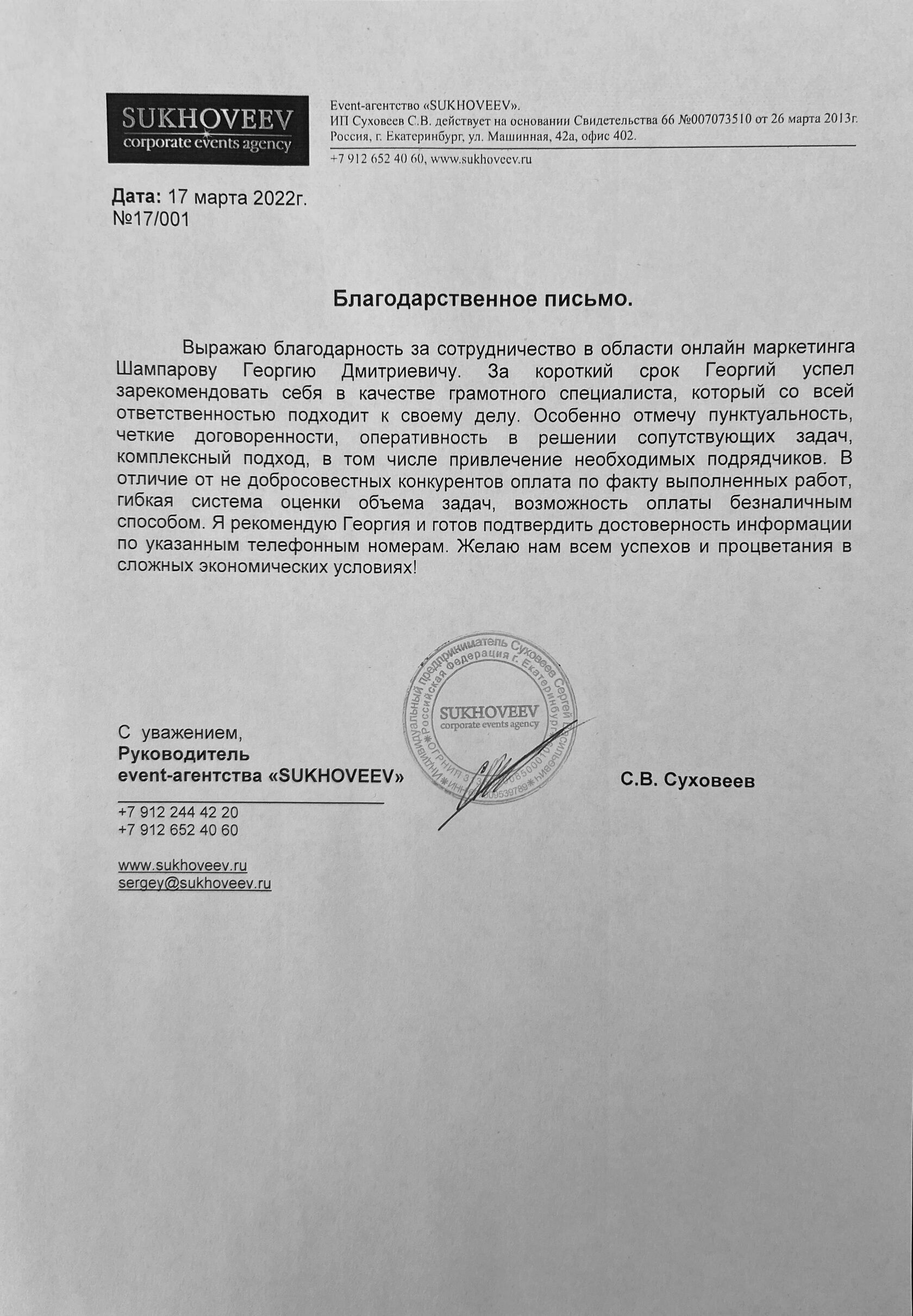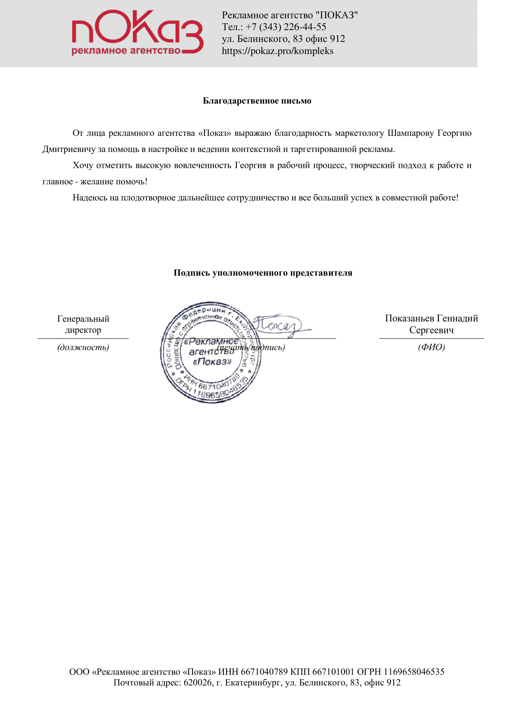 От лица рекламного агентства "Показ" выражаю благодарность маркетологу Шампарову Георгию Дмитреевичу...