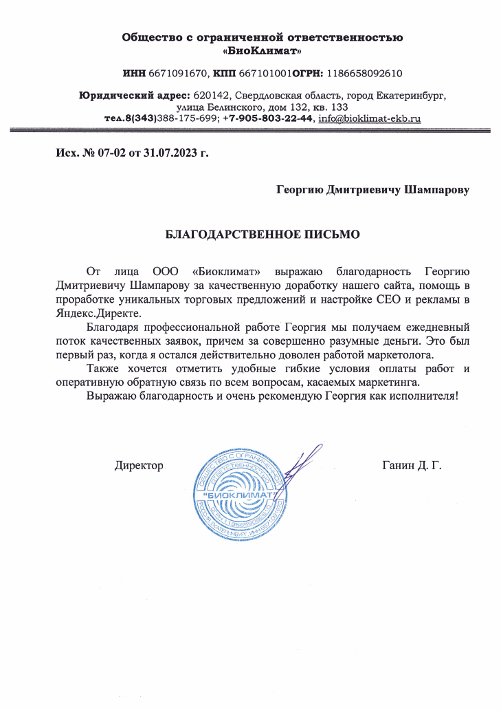 От лица ООО "Биоклимат" выражаю благодарность Георгию Дмитриевичу Шампарову за качественную доработку нашего сайта...