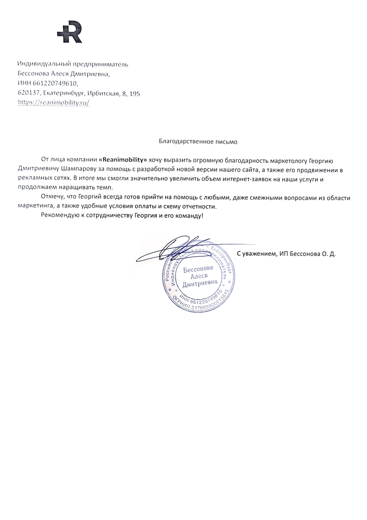От лица компании "Reanimobility" хочу выразить благодарность маркетологу Георгию Дмитрию Шампарову за помощь с разработкой...